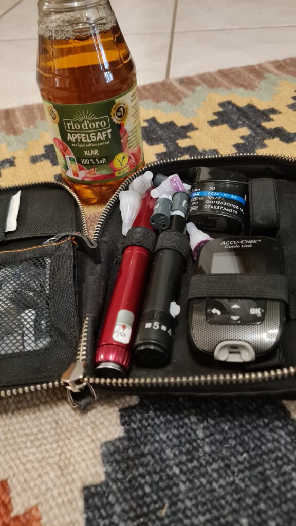Ebenso muss ich immer Traubenzucker oder Apfelsaft bei mir haben um mir selbst helfen zu können, wenn der Blutzucker zu niedrig ist. Und das passiert mir leider regelmäßig, bei sportlichen Aktivitäten.