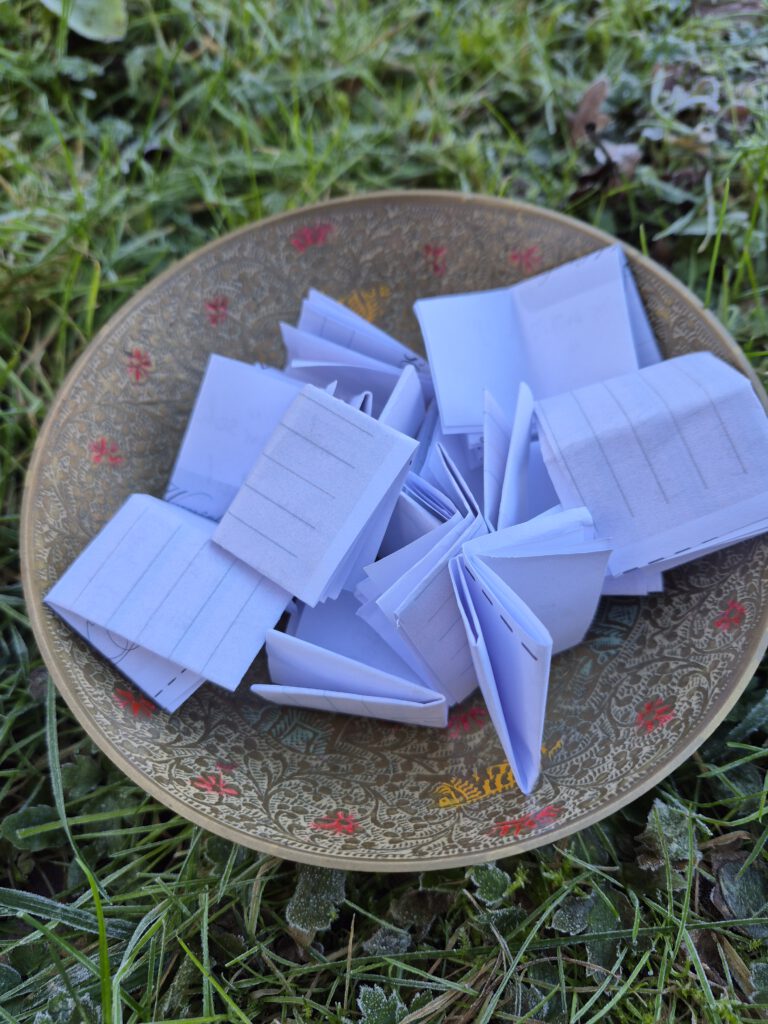 Also Plan B: Alle auf einmal! Am Neujahrstag haben mein Partner und ich unsere jeweils 12 Wünsche geschnappt, raus in die Kälte, ein kleines Lagerfeuer auf der Terrasse (okay, eher ein Mini-Feuerchen in einer Schale).