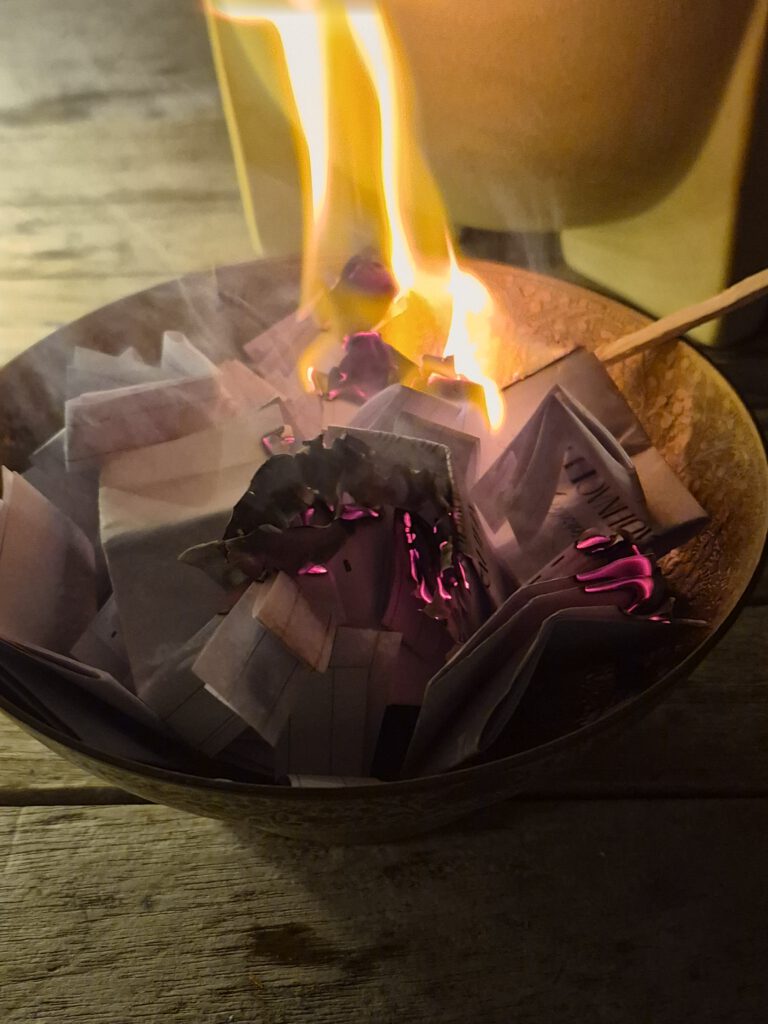 Während die Flammen tanzten, dachte ich: Vielleicht ist es gar nicht so wichtig, wann man loslässt. Hauptsache, man tut es. Und ehrlich? Es fühlte sich gut an. Ein bisschen verrückt. Und sehr nach „Bestellung beim Universum“.